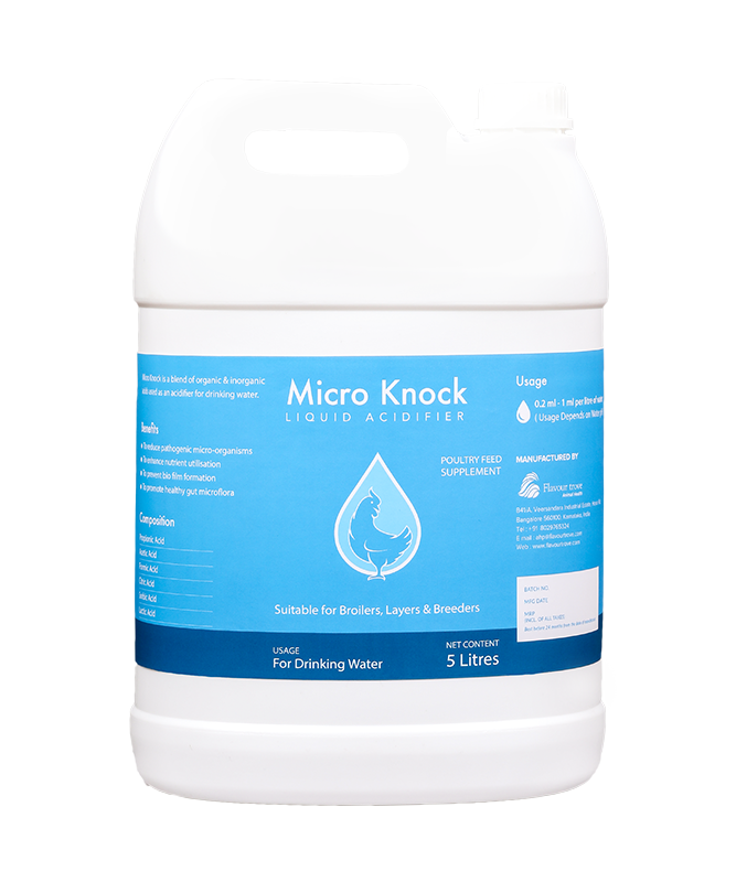 Micro Knock is a scientific blend of organic & inorganic acids used as an acidifier for drinking water. It stops the growth of pathogenic micro-organisms by lowering water pH & disrupting the metabolism of these pathogens.